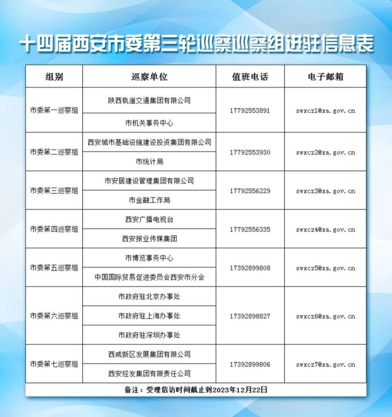 經(jīng)市委批準,十四屆市委第三輪巡察共成立7個巡察組,分別對陜西軌道交通集團有限公司、市統(tǒng)計局、市金融工作局、市機關(guān)事務(wù)中心、市博覽事務(wù)中心、西安報業(yè)傳媒集團、西安廣播電視臺、中國國際貿(mào)易促進委員會西安市分會、西安城市基礎(chǔ)設(shè)施建設(shè)投資集團有限公司、市安居建設(shè)管理集團有限公司、市政府駐北京辦事處、市政府駐上海辦事處、市政府駐深圳辦事處等13家單位開展常規(guī)巡察,對西咸新區(qū)發(fā)展集團有限公司、西安經(jīng)發(fā)集團有限責(zé)任公司2家單位開展提級巡察。